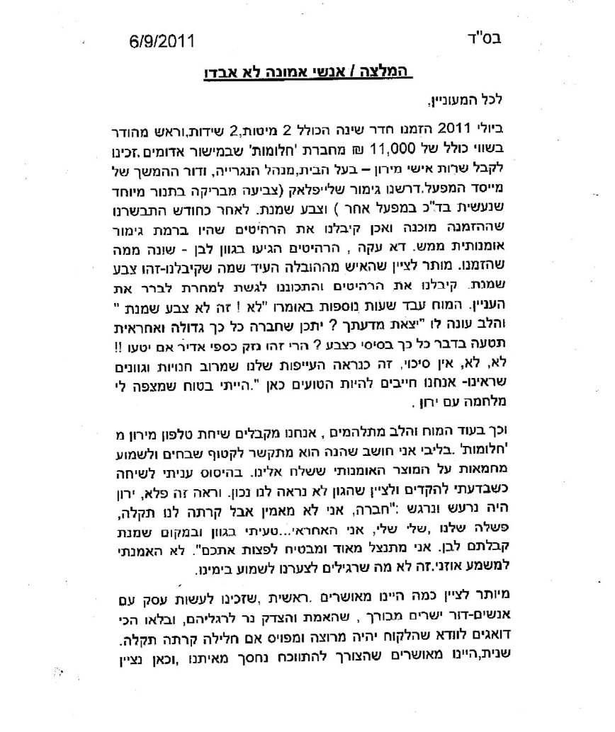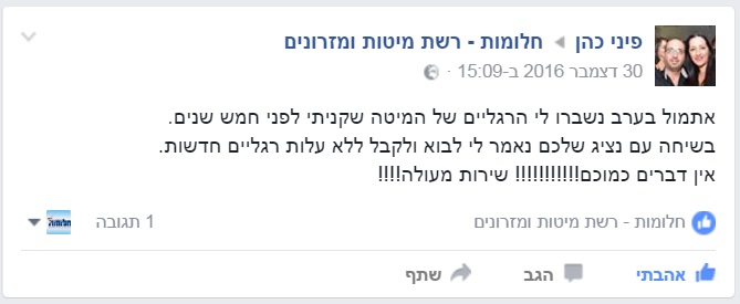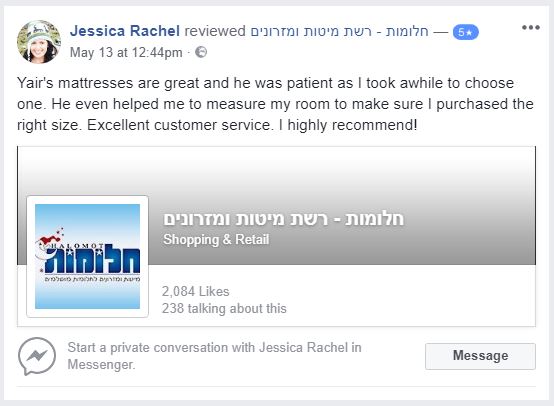 אדגיש ואציין שהשרות מתחילתו ועד סופו היה יוצא דופן, ולכן אמליץ לכל מי שמחפש לבצע רכישה של מיטות/מזרנים לפנות לחברת “חלומות”.