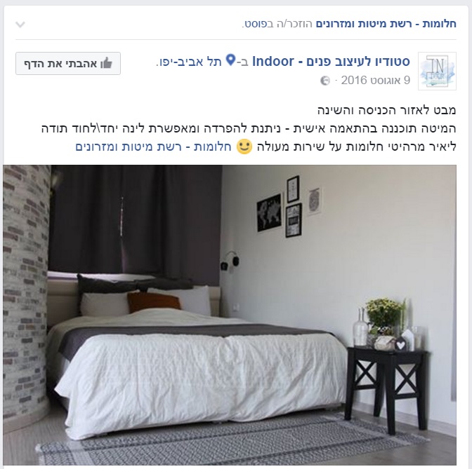 החל ממענה אדיב ,חביב וסבלני לשאלות בטלפון ובהמשך בייעוץ וההצעות הענייניות והמועילות כולל משלוח תמונות נוספות. זמן האספקה של ההזמנה הלא סטנדרטית היה מדהים- הובטח ארבעה ימים ונראה לא ריאלי. אבל תוך ארבע ימי עסקים הכל הגיע!!! הזמנו מיטה יהודית ומזרנים שהיא שילוב של שני סוגי מיטות ,שידות וקומודה לא במידות סטנדרט, והכל הגיע בארבעה ימים ובאיכות מצוינת. תמשיכו להיות טובים.