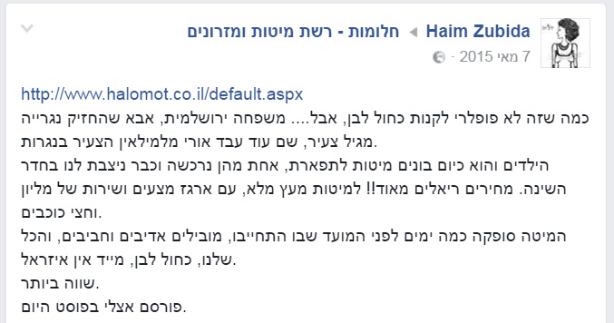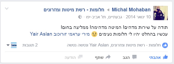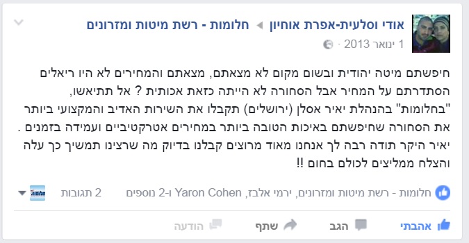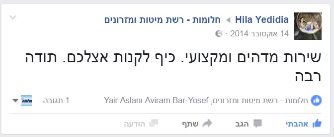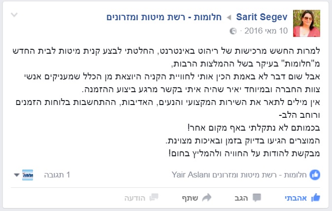 אני רכשתי מיטה מחברתכם אומנם לפני מס’ חודשים אבל פשוט הייתי חייב לדווח על שירות אדיב,מוצלח,ומספק מאוד מהצוות של חלומות מכל תשומת הלב ובמיוחד מבחור בשם ירון שנתן מענה גם לצורך ספציפי מסויים גם כשלא היה צריך..ועל המיטה בכלל אין לי מילים!! פשוט כמו שם החברה “ח-ל-ו-מ-ו-ת” היא עושהה!!! תעלו ותצליחו!