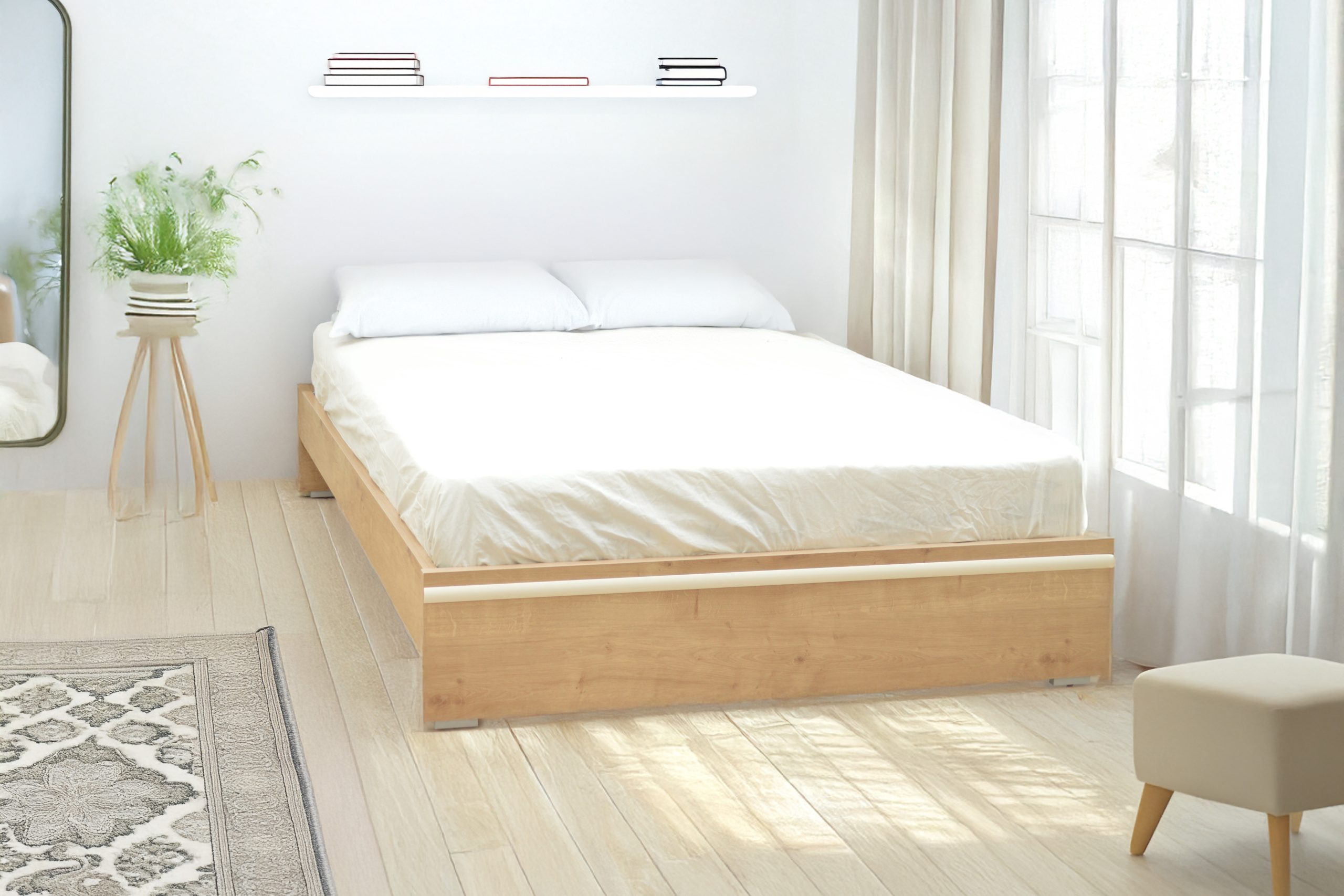 בסיס המיטה קורות עץ אורן ומעליהן פלטה אחידה של דיקט – לתמיכה חזקה במזרן