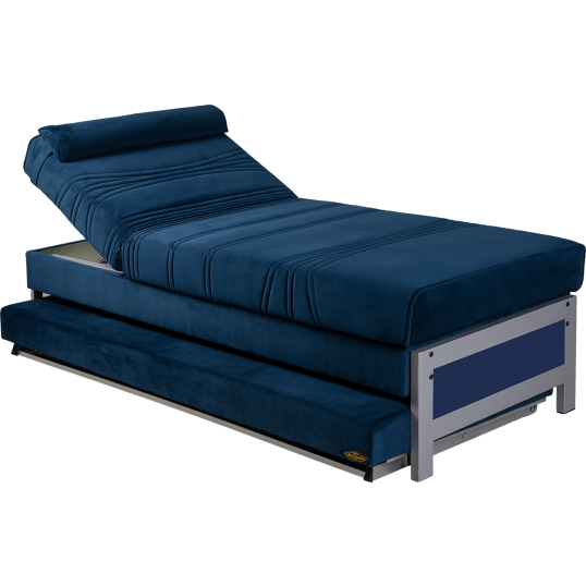 ארגז מצעים ומיטה כפולה נפתחת ומתרוממת לאותו הגובה.