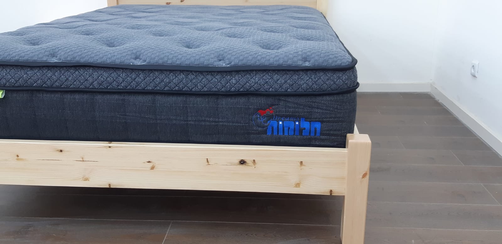 בסיס המיטה עשוי קורות עץ אורן מלא ועליהן פלטה אחידה של דיקט לתמיכה נכונה במזרן
