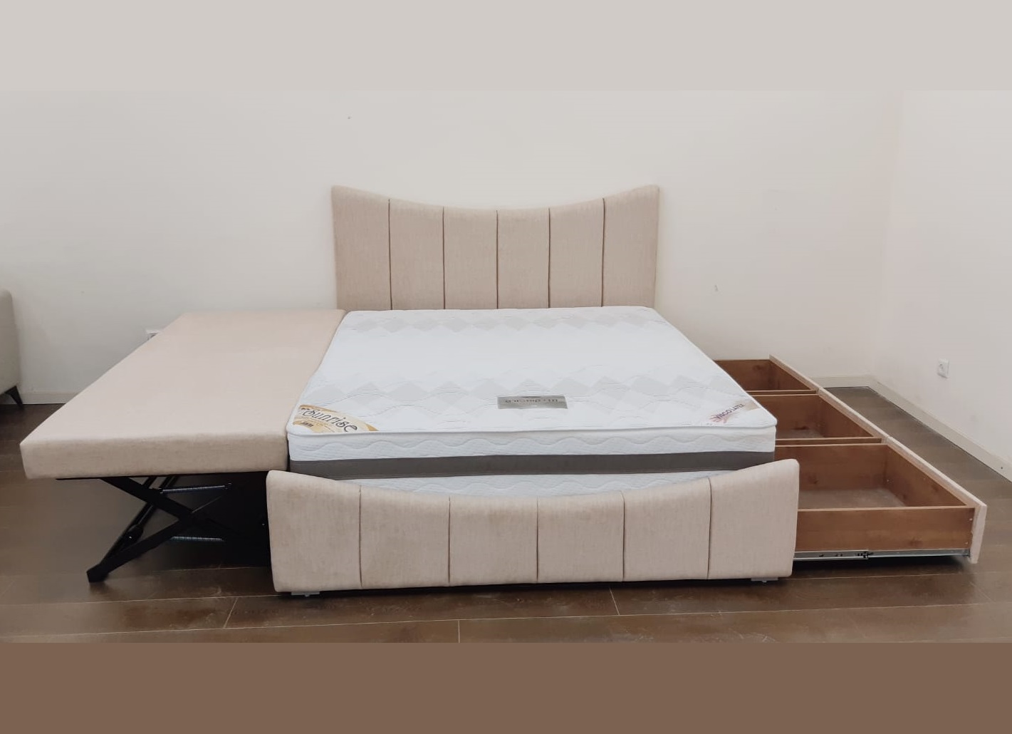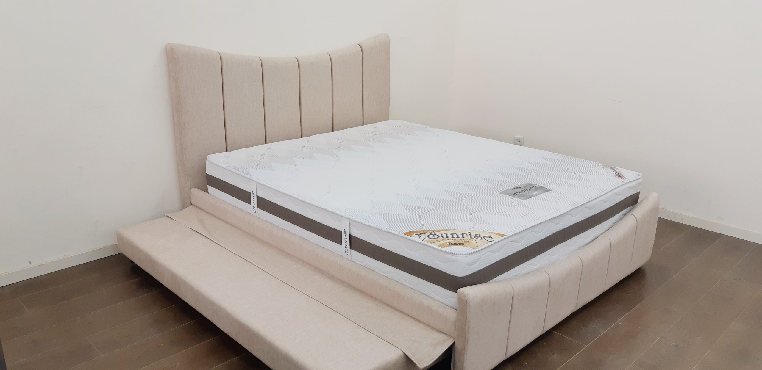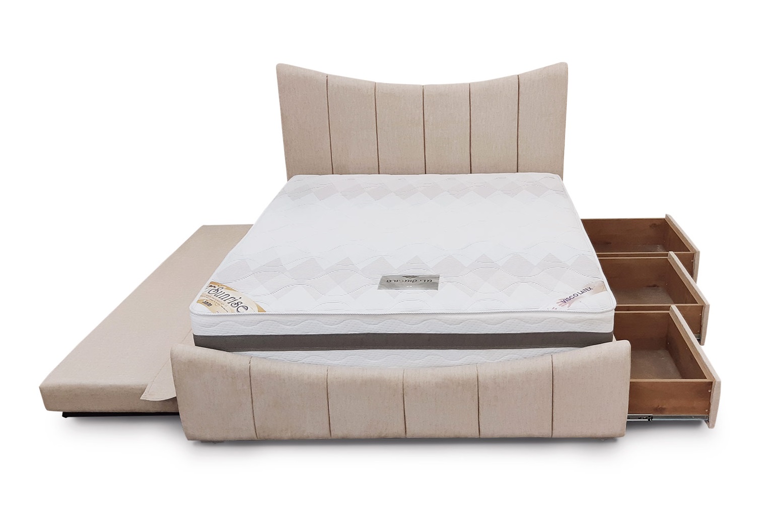 מיטה זוגית מרופדת דגם קשת , עם מיטה נוספת נשלפת מתרוממת ומגירות לאחסון.