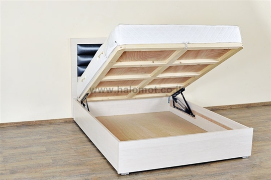 מיטה עם ארגז מצעים לאחסון וכן ראש מיטה מרופד.