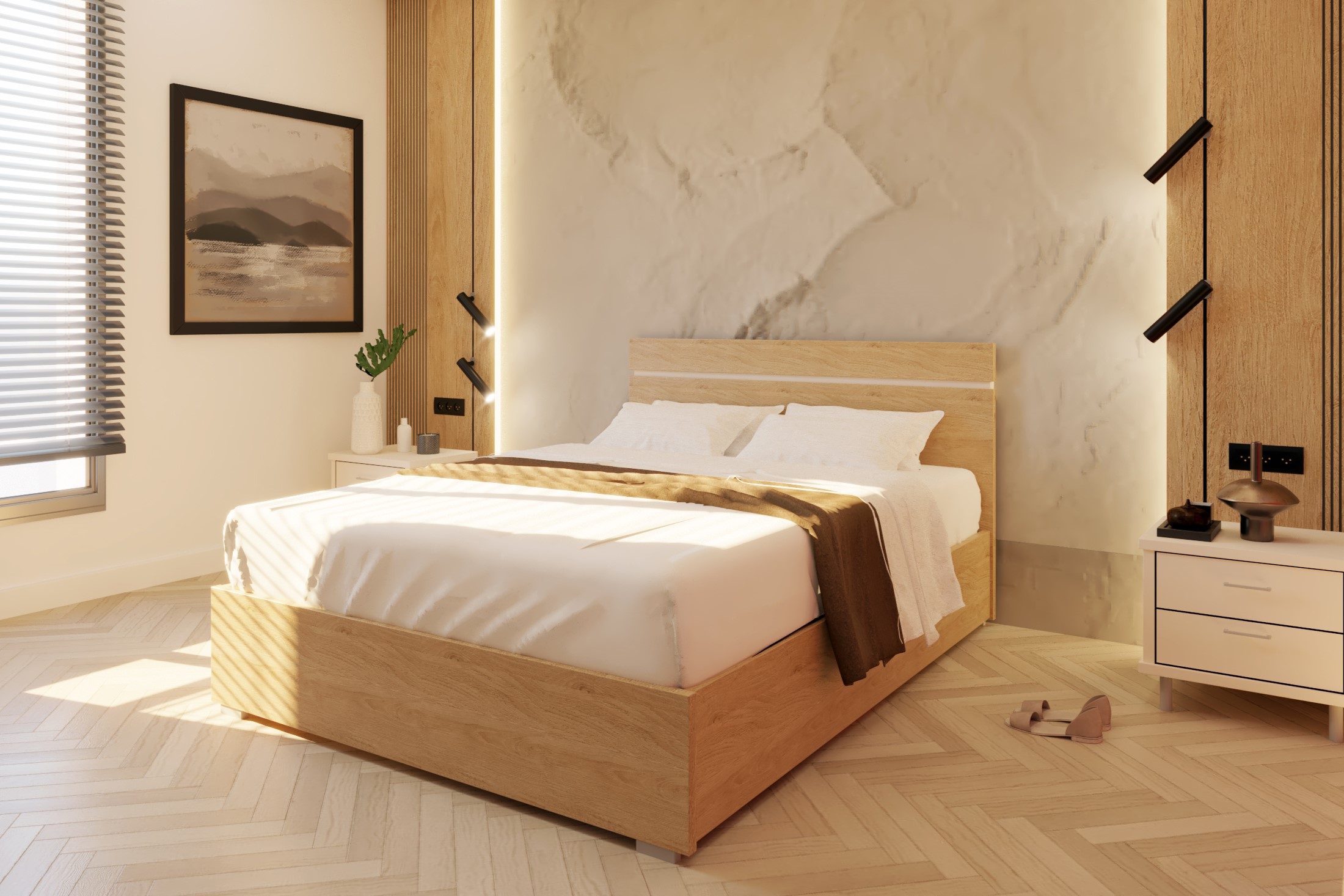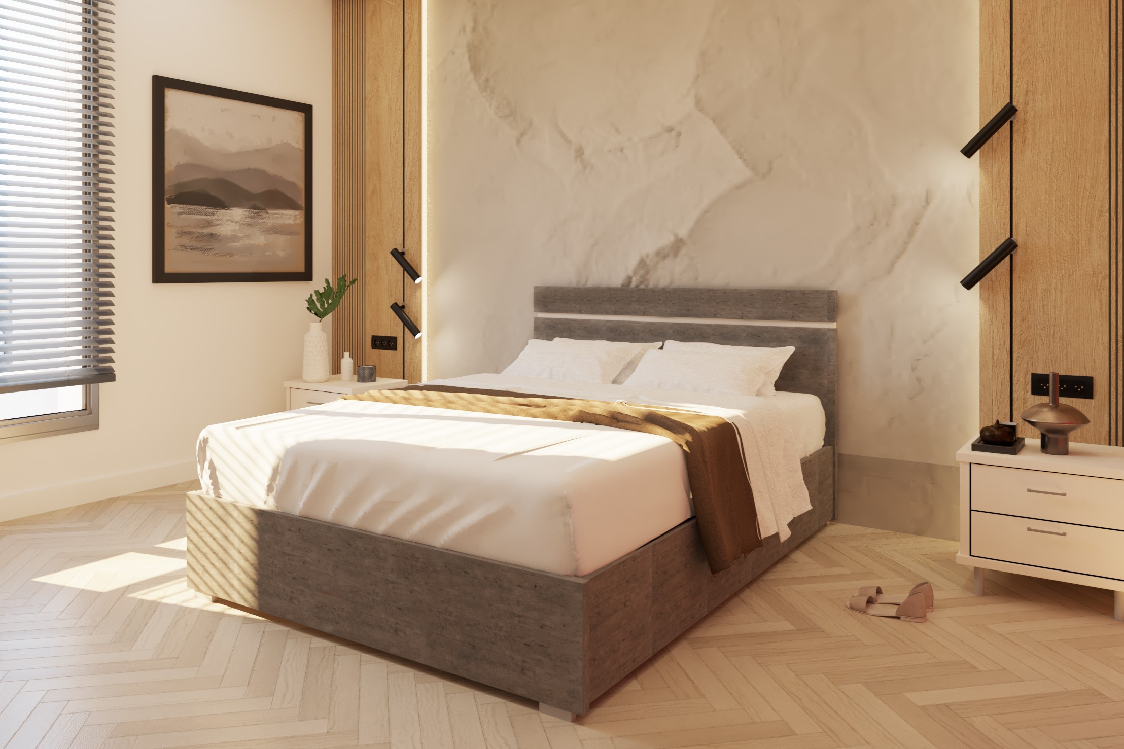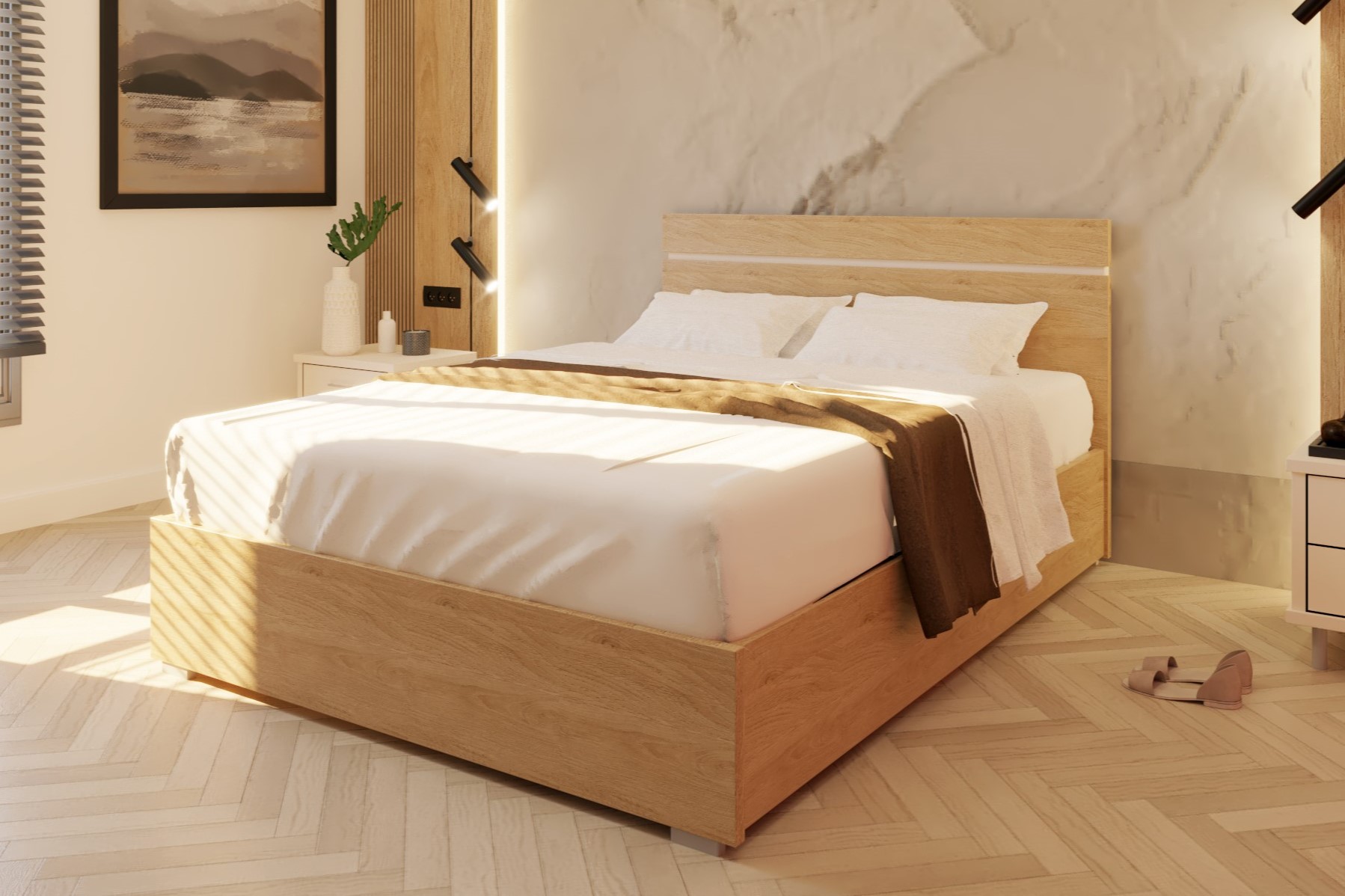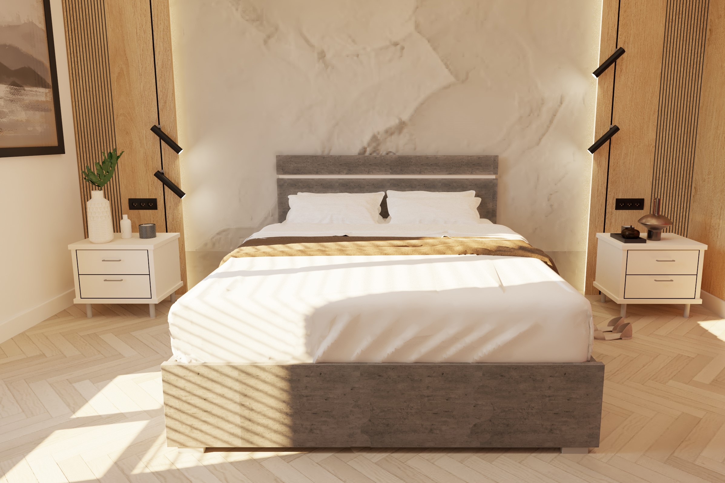 ראש המיטה מעוצב בדוגמא של פס שקוע