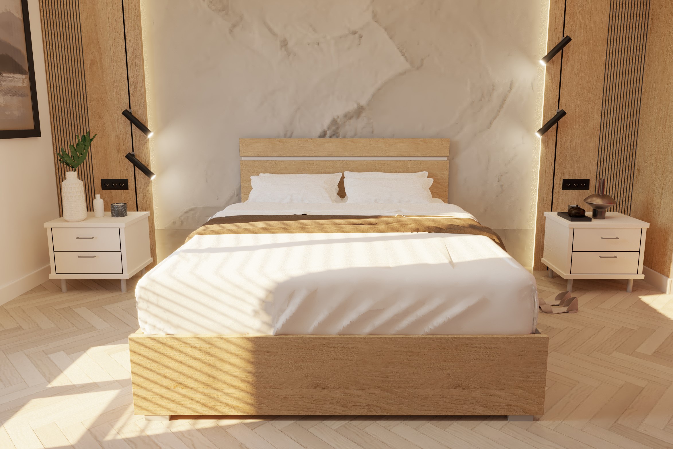 בסיס המיטה קורות עץ אורן ועליהן פלטה אחידה של דיקט לתמיכה נכונה במזרן