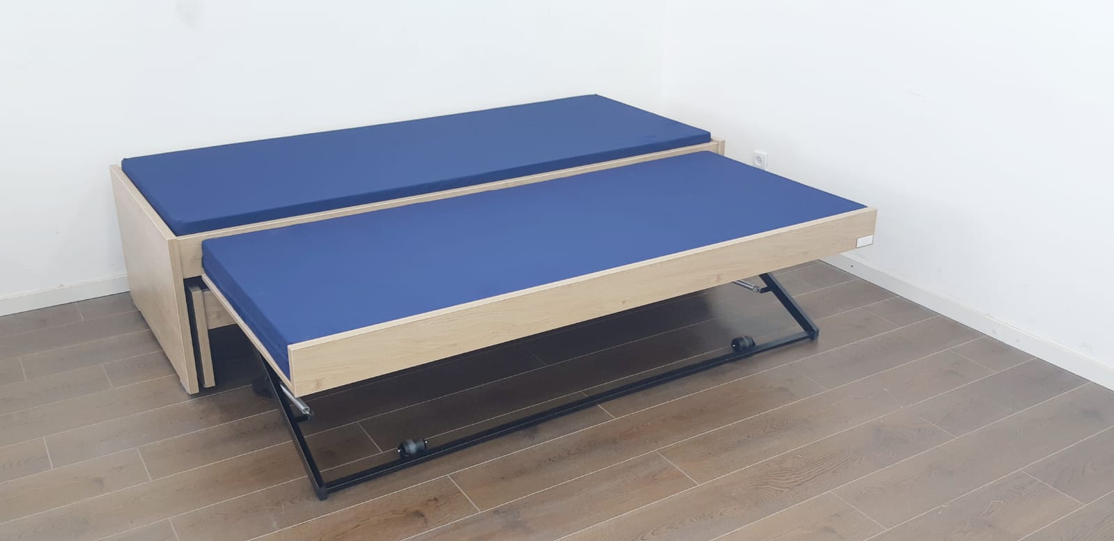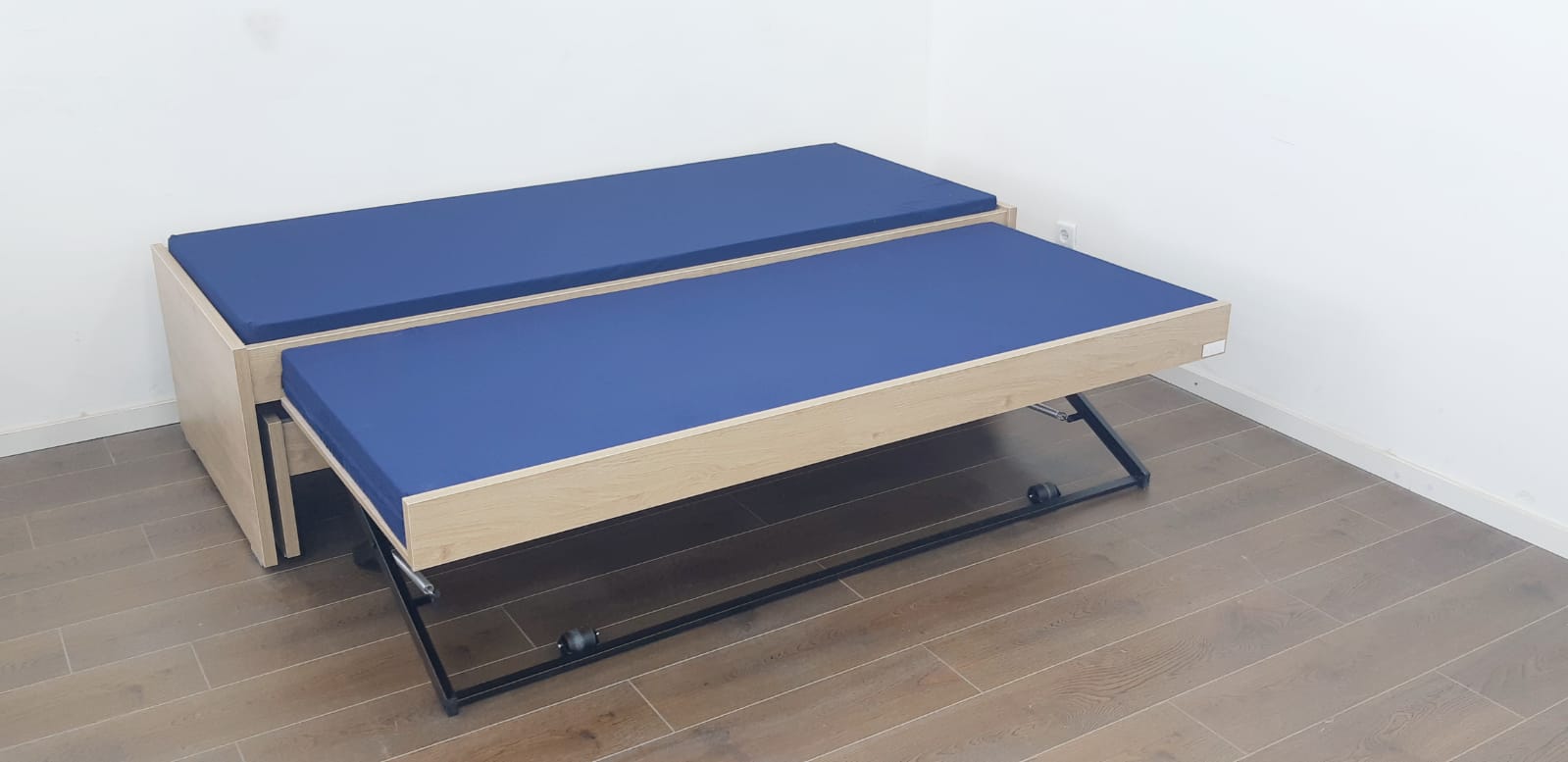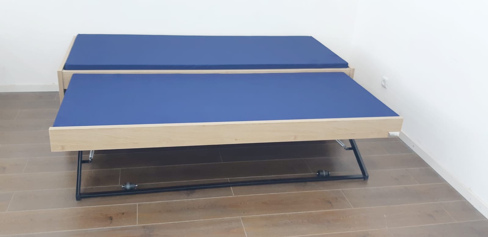 שתי המיטות העליונות נשארות בגובה קבוע , והמיטה התחתונה עולה ע’י מנגנון היירייז.