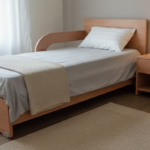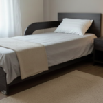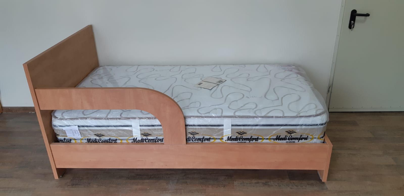 מיטה יחיד עם מעקה להגנה קבוע ומחובר למיטה .