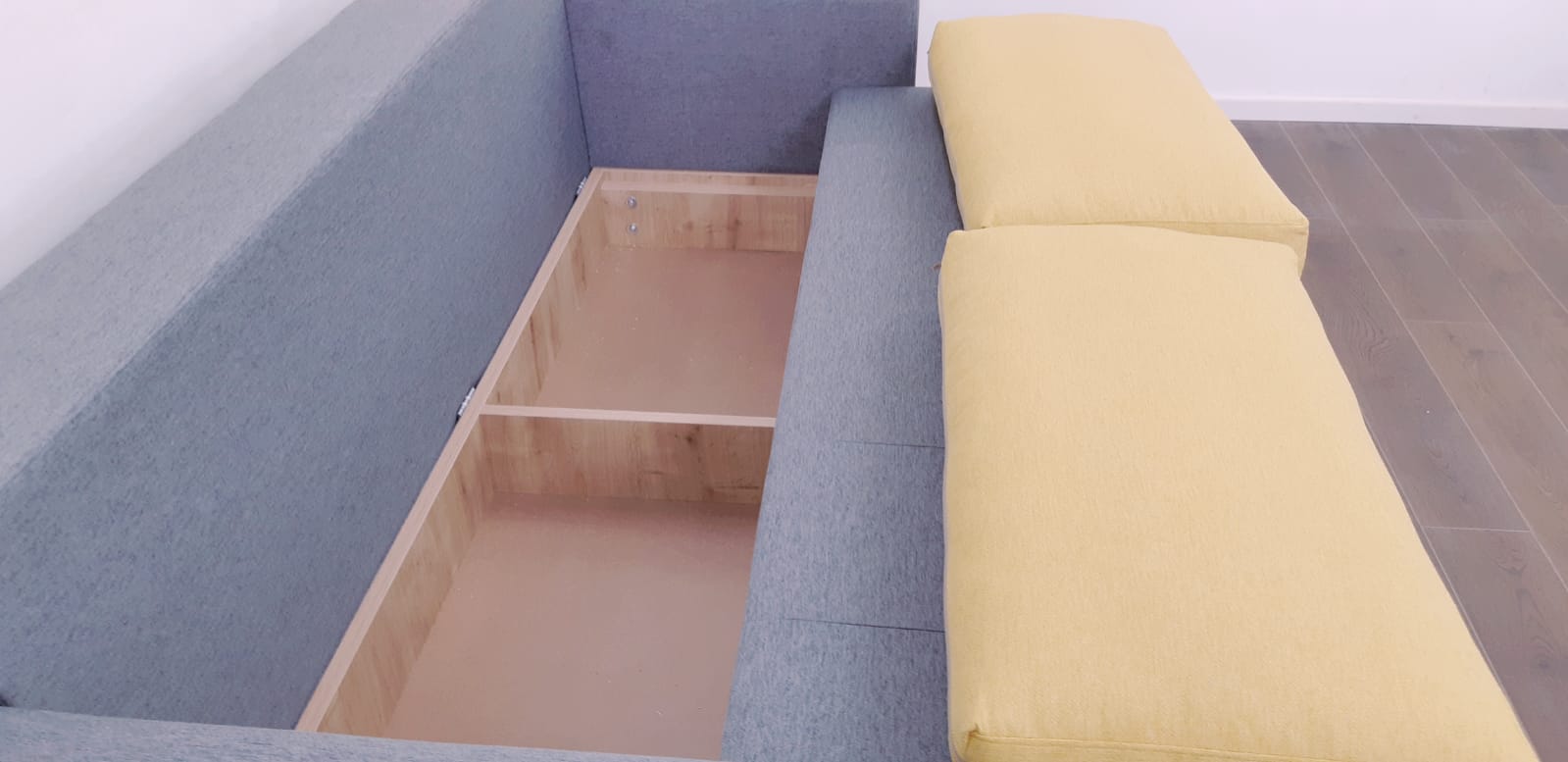 ספה הנפתחת למיטה זוגית עם ארגז מצעים מובנה.