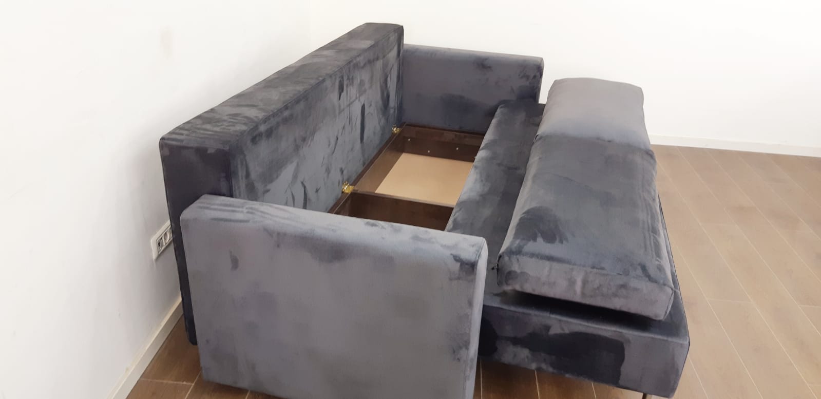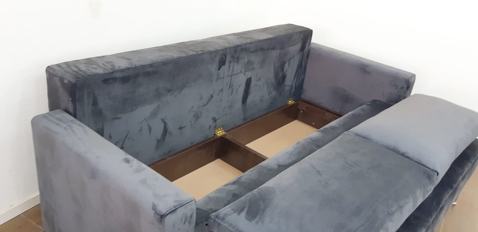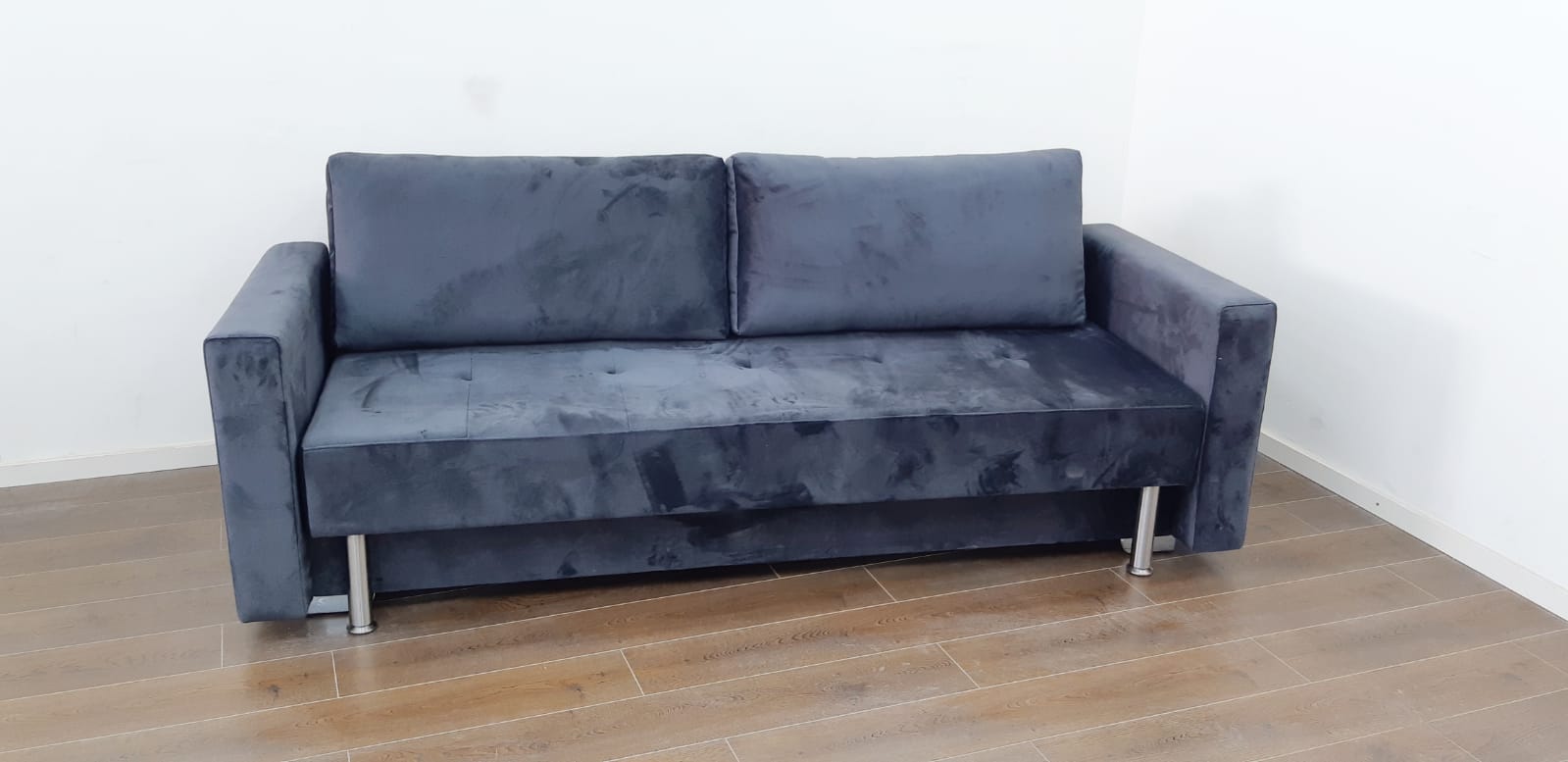 ספה הנפתחת למיטה זוגית עם ארגז מצעים מובנה.